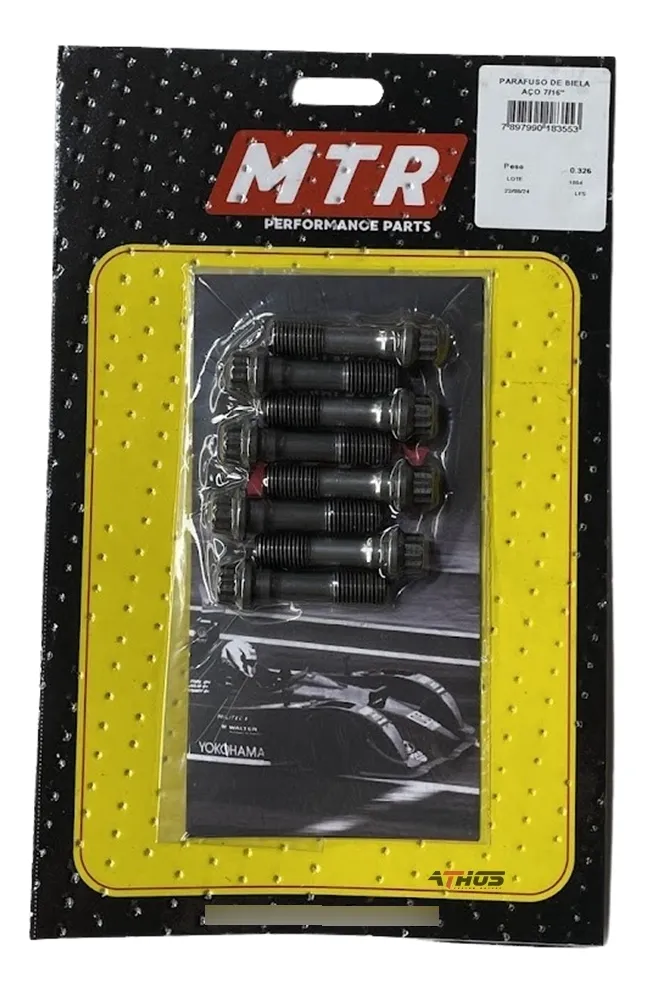 Este é um Jogo de Parafusos de Biela da marca MTR, projetado para motores de alta performance. São parafusos forjados em aço de alta resistência, especificamente desenvolvidos para suportar cargas extremas, sendo indicados para projetos que atingem até 1000 cavalos de potência.